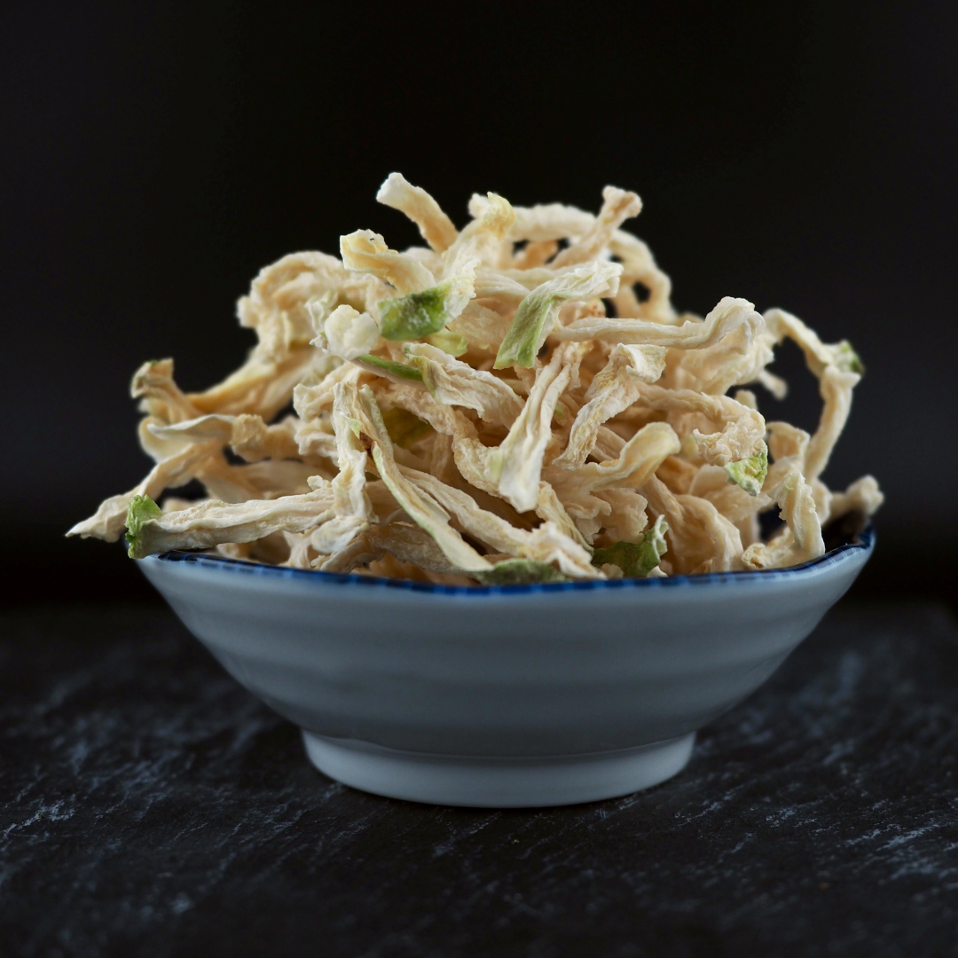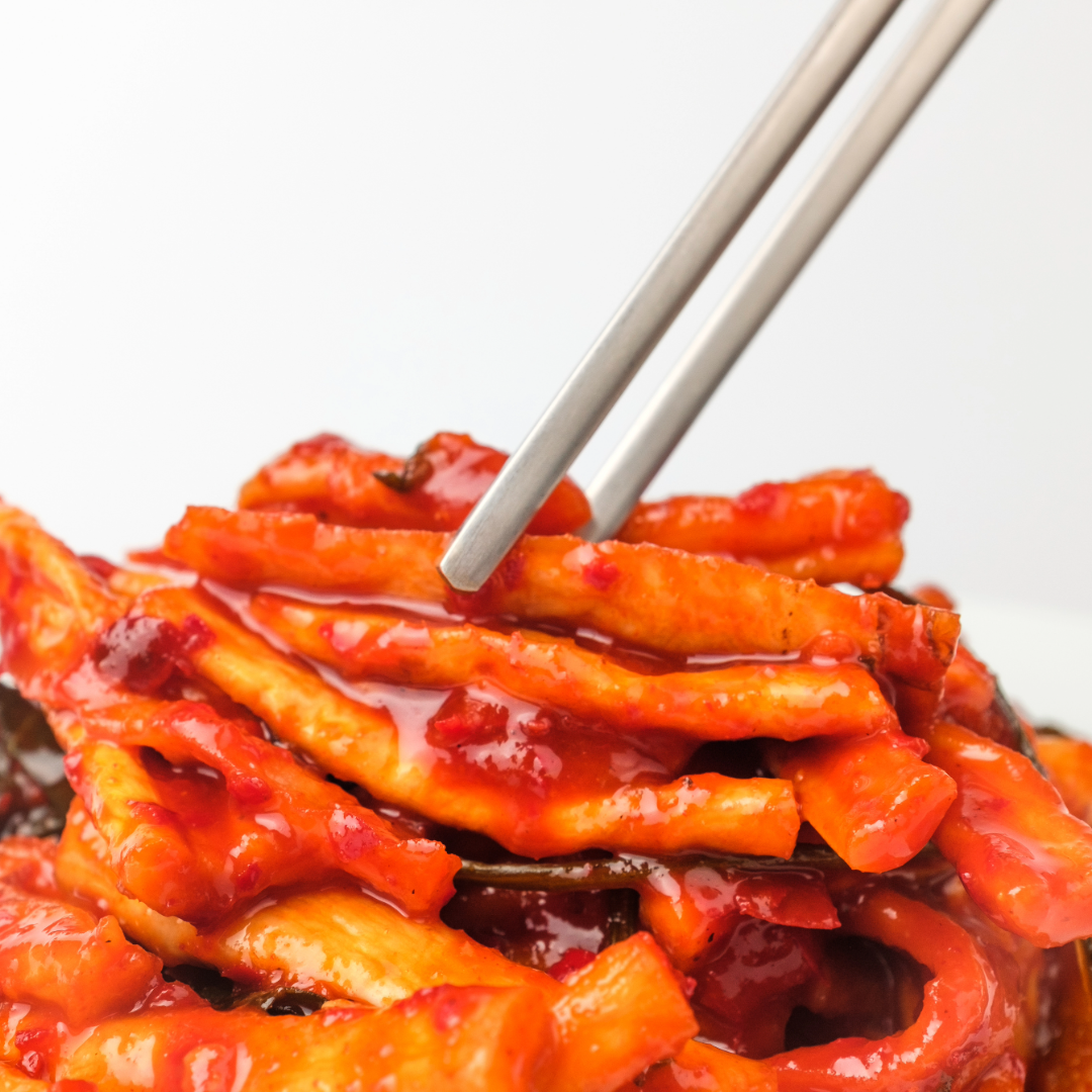 Mu-Mallaengi (무말랭이) is a traditional Korean side dish made from dried radish strips (mu-mallaengi) that are seasoned with a spicy and sweet gochujang-based sauce.