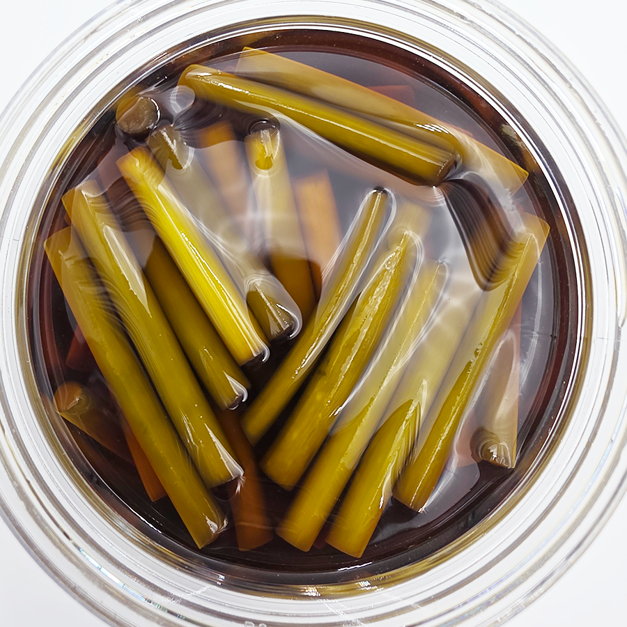 These garlic stems have been pickled in a mix of soy sauce and rice vinegar. In Korea, pickling often relies on soy sauce as the base, with each vegetable lending its own character to make the pickle unique. After a week, the stems are still crisp with a salty-sweet flavour and they pair perfectly with Korean BBQ.